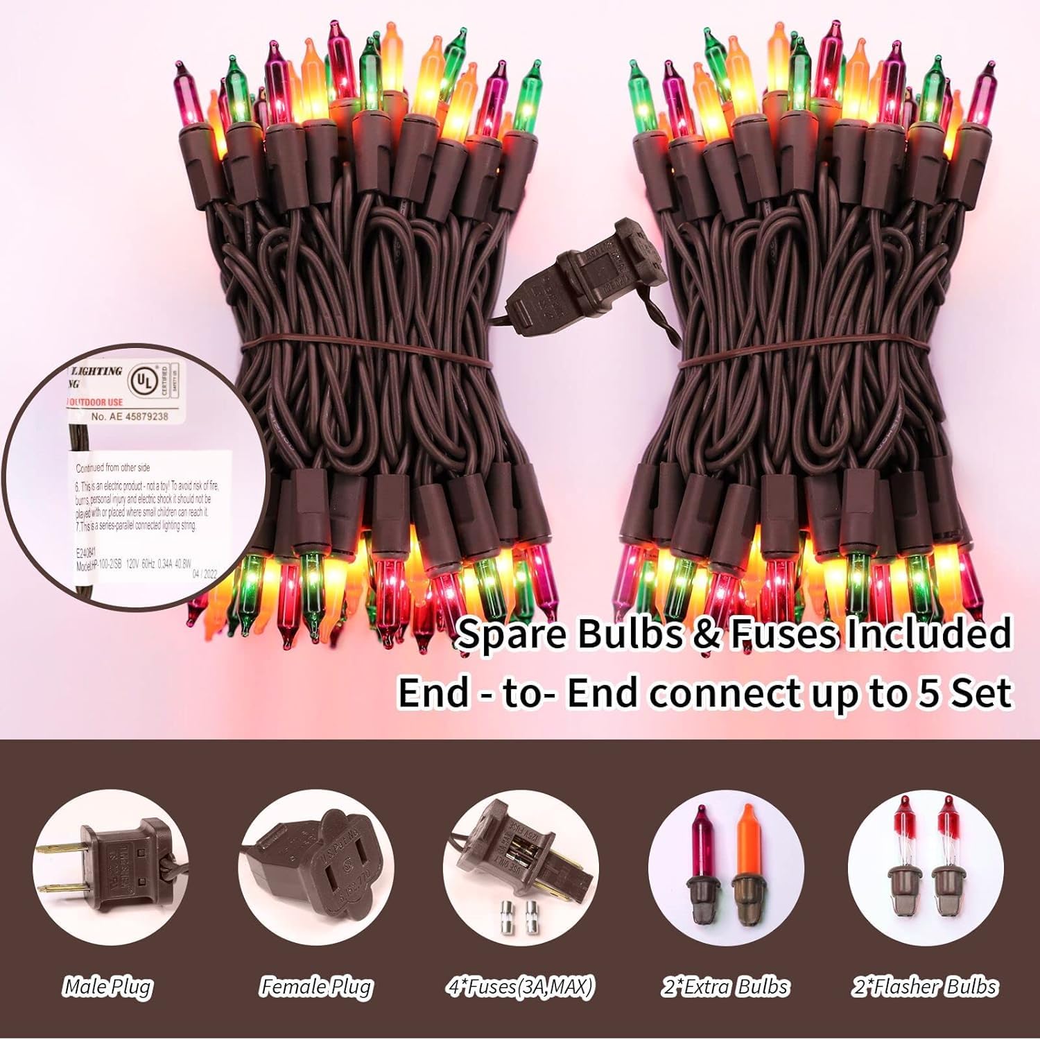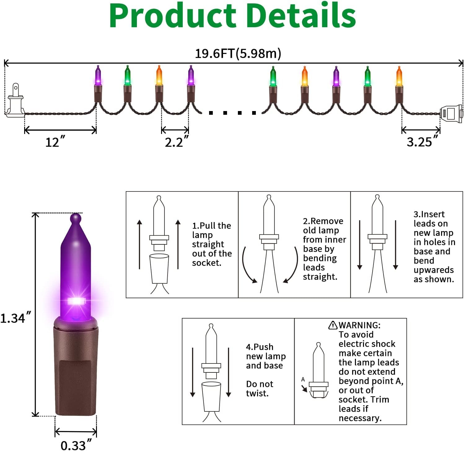 • 19.6FT BROWN WIRE STRING LIGHTS: 100-count Orange+Purple+Green lights, with 2 flasher bulbs, 2 extra bulbs, and 2 replacement fuses . Each bulb space 2.5inch, 2.5V and 0.425W per bulbs, built-in 3A fuse for safe use.