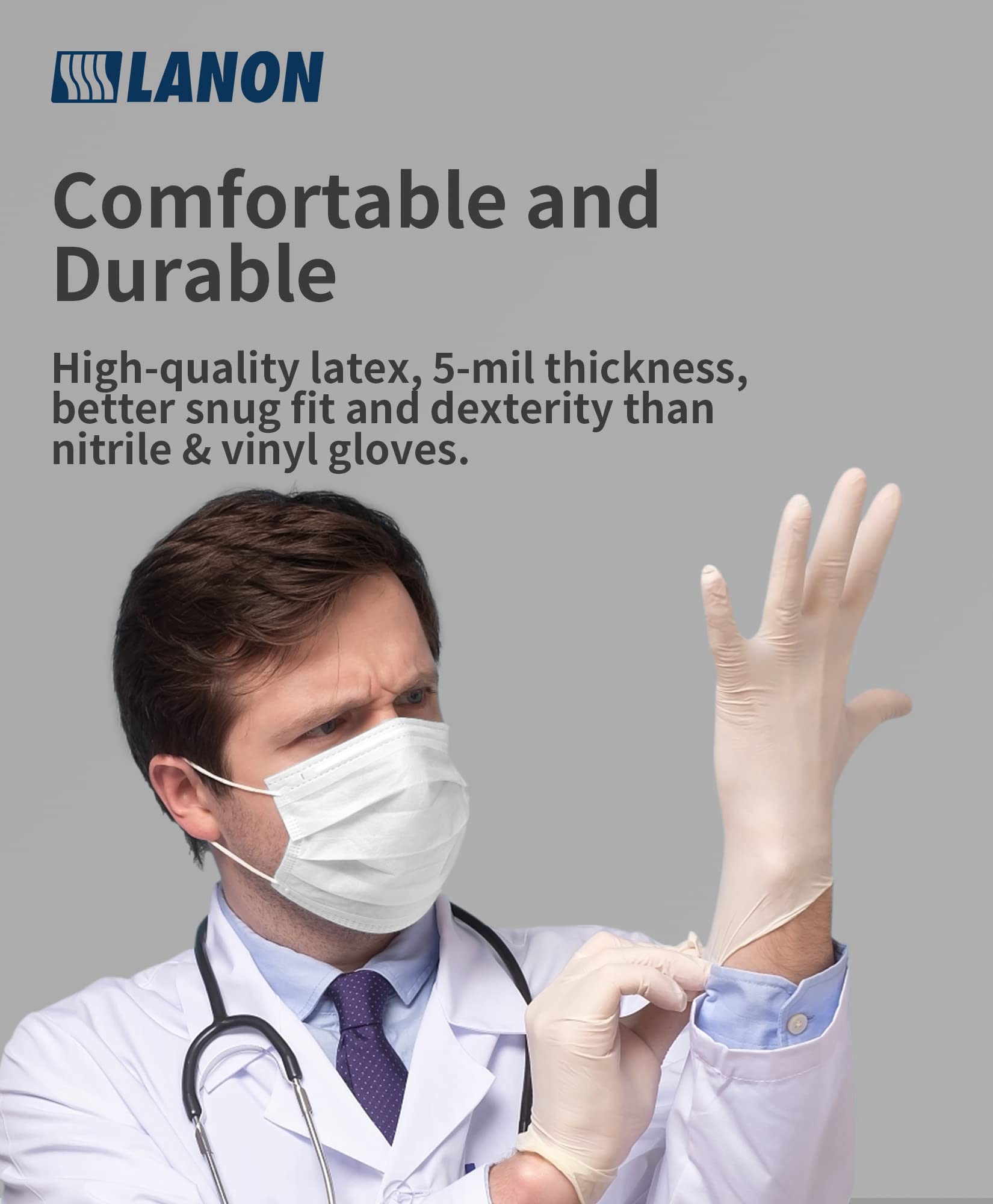 • Next-Level Performance - LANON latex gloves have an Acceptable Quality Level (AQL) of 1.5. Each box comes with 100 pairs, and is available in 4 different sizes: small, medium, large, and xl.