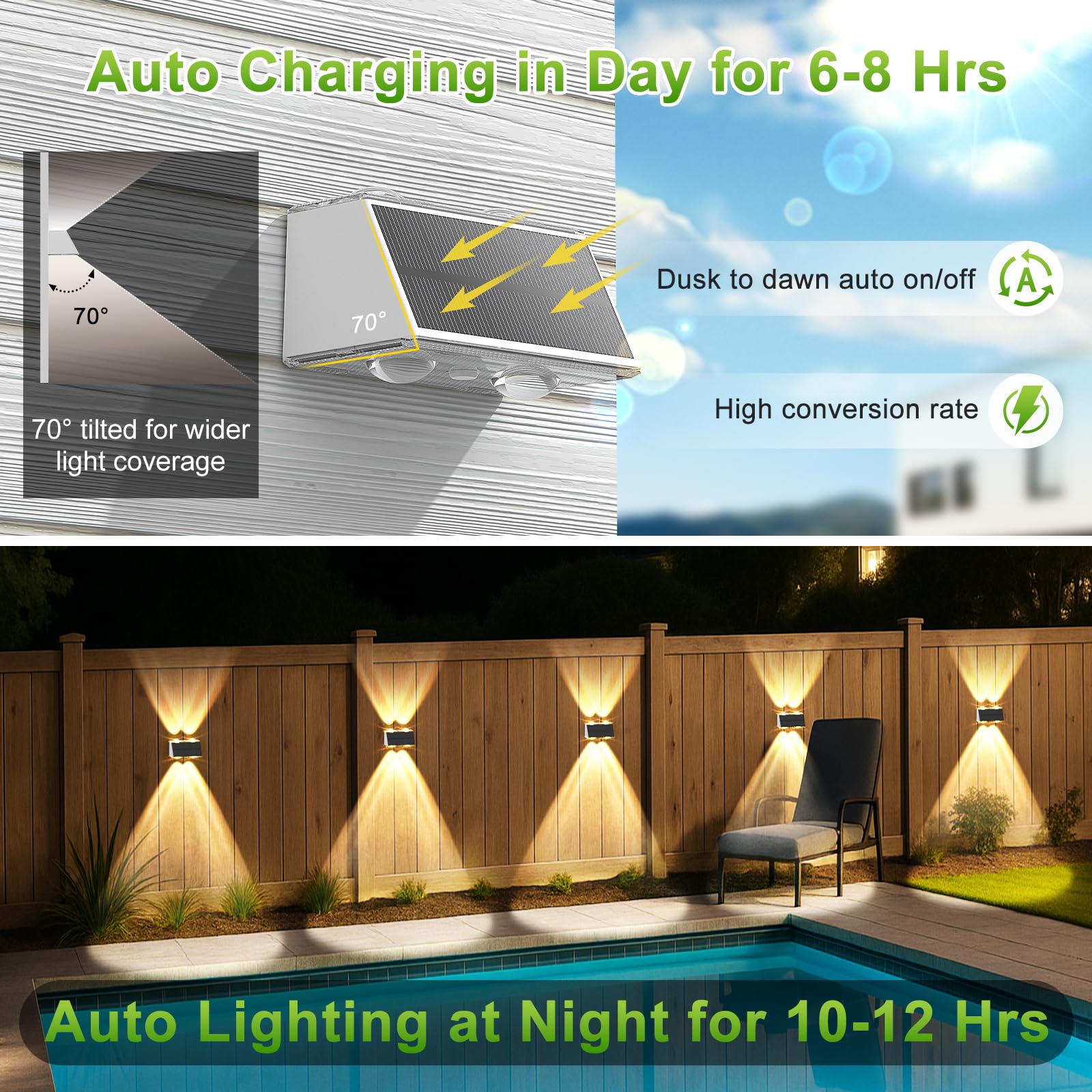• 【Auto Working & Long Lasting Performance:】 Equipped with a high-efficiency solar panel, LANSOW solar wall lights can achieve a conversion rate of up to 20% after just 6–8 hours of sunlight exposure. Once fully charged, they provide over 10 hours of illumination—more than enough for daily lighting needs. The extended battery life ensures seamless operation from dusk till dawn, helping you save on electricity bills. These outdoor solar lights feature an automatic brightness sensor, turning on at dusk to illuminate key areas such as fences, decks, backyards, patios, and more.