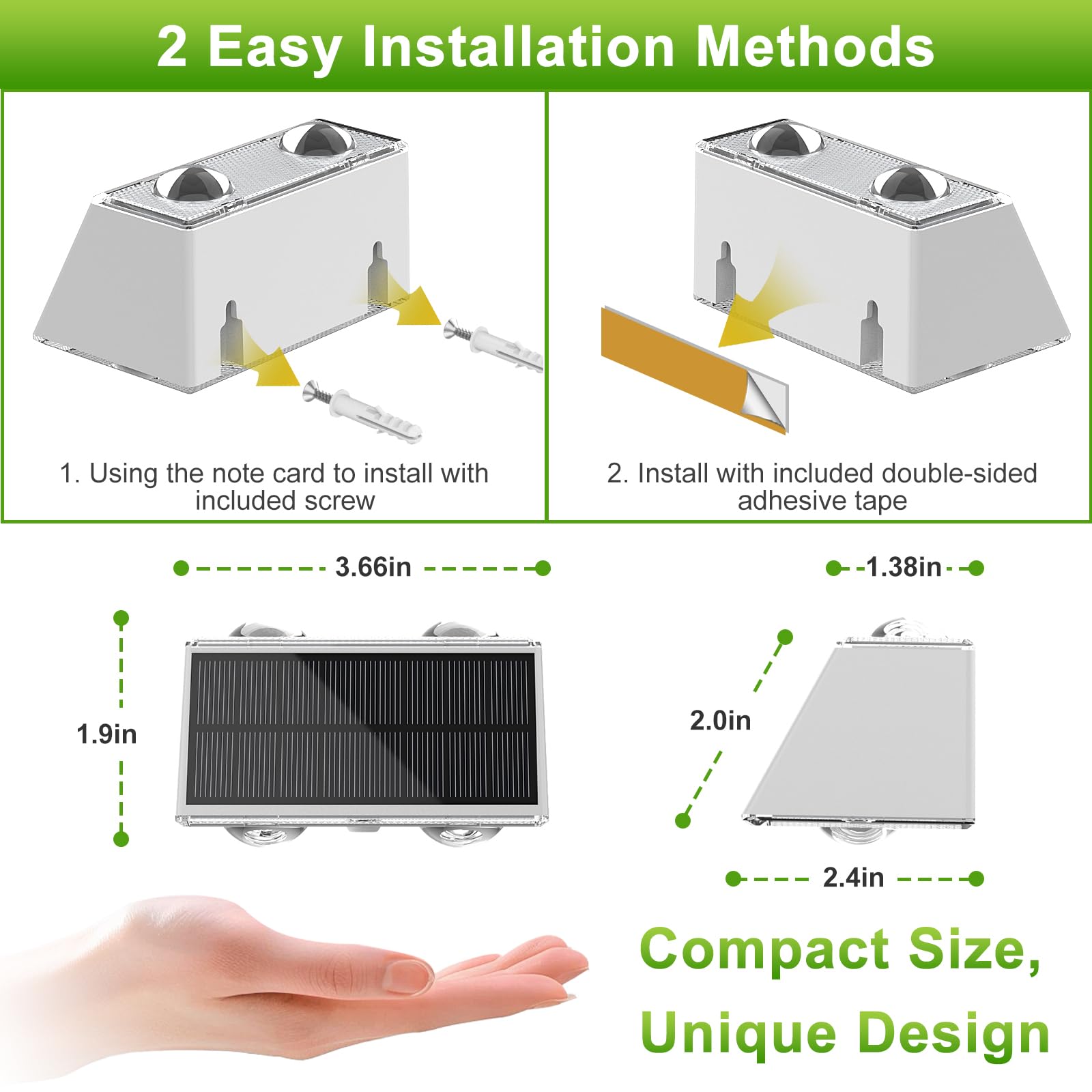 • 【Two Installation Methods& Versatile Use:】 Lightweight and easy to install, LANSOW solar lights outdoor wateproof can be mounted in minutes using either included screws(for permanent placement) or the attached double-sided adhesive tapes(for temporary use—no tools required). Compatible with wood, vinyl, and brick surfaces without causing damage. Measuring just 3.66 × 2.40 × 1.90 inches, they provide perfect spot lighting for fence lines. No wiring or outlets are needed. Perfectly used to decorate your fence, wall, patio, deck, step, stair railing, fence post, garden, yard, pathway, stair handrail, porch, poolside area,etc.