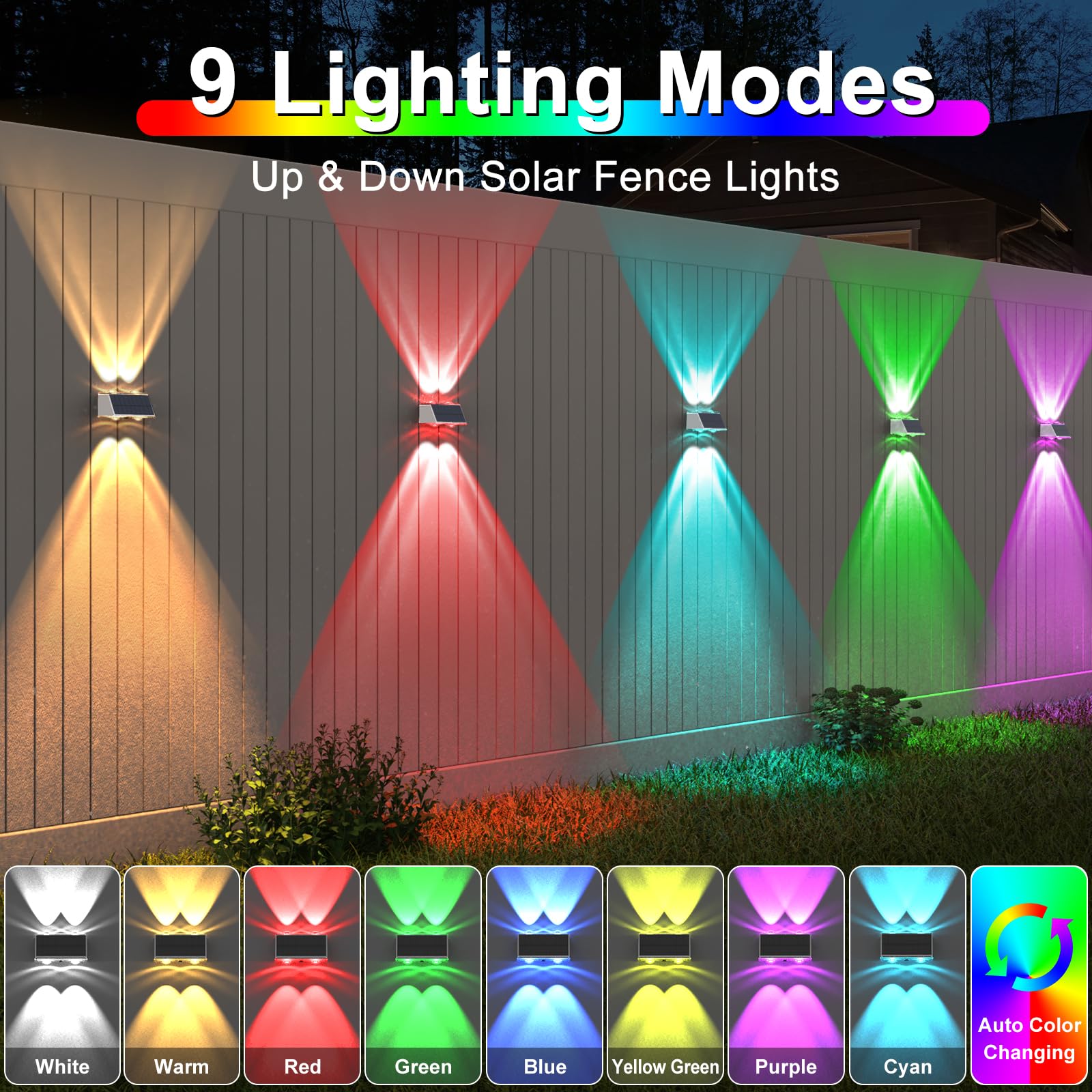 LANSOW Solar Fence Lights 12 Pack, Solar Powered Lights Outdoor Waterproof, 9-Mode Warm/Cool White & RGB Up-Down Led Spot Wall Lights Dusk to Dawn Decor for Backyard, Deck, Patio, Pool, Railing(White)