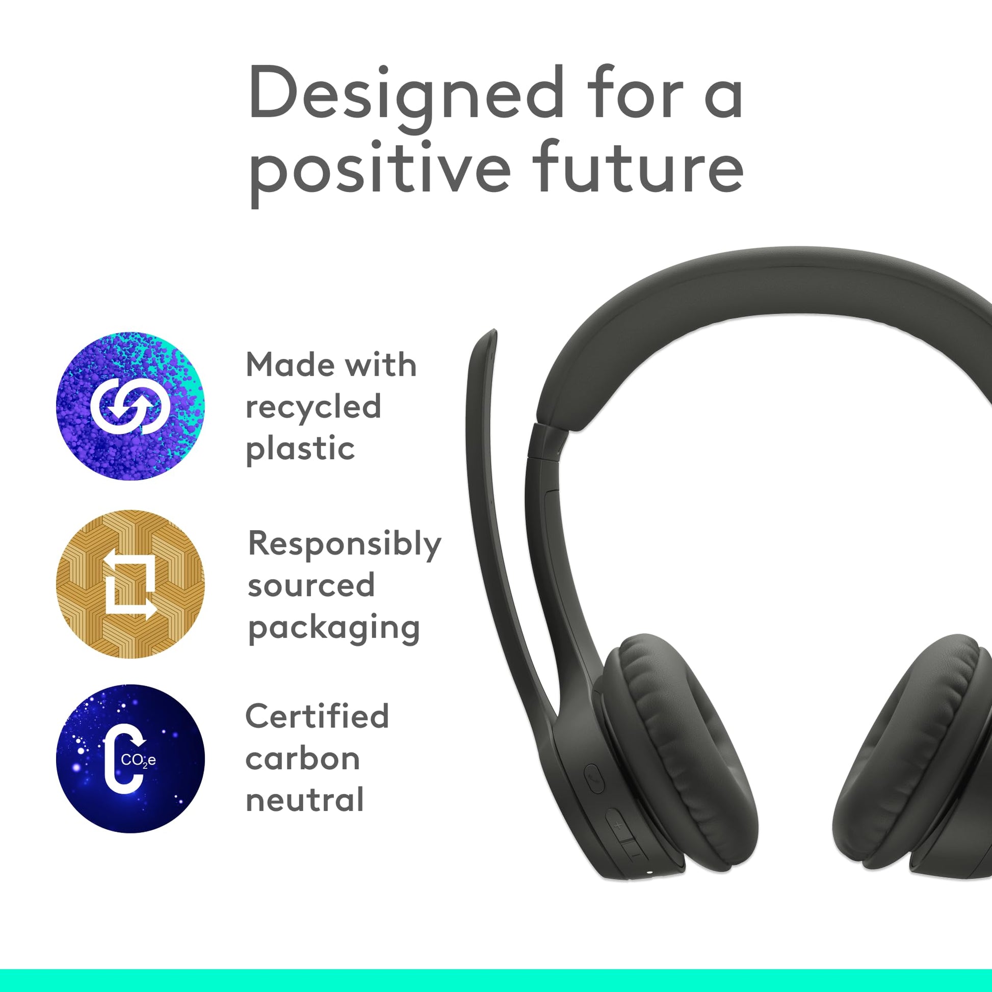 • The Logitech Zone 300 Bluetooth Wireless Headset is certified carbon neutral and includes certified post-consumer recycled plastic (Graphite: 55%, Off-white and Rose: 42%)(4)