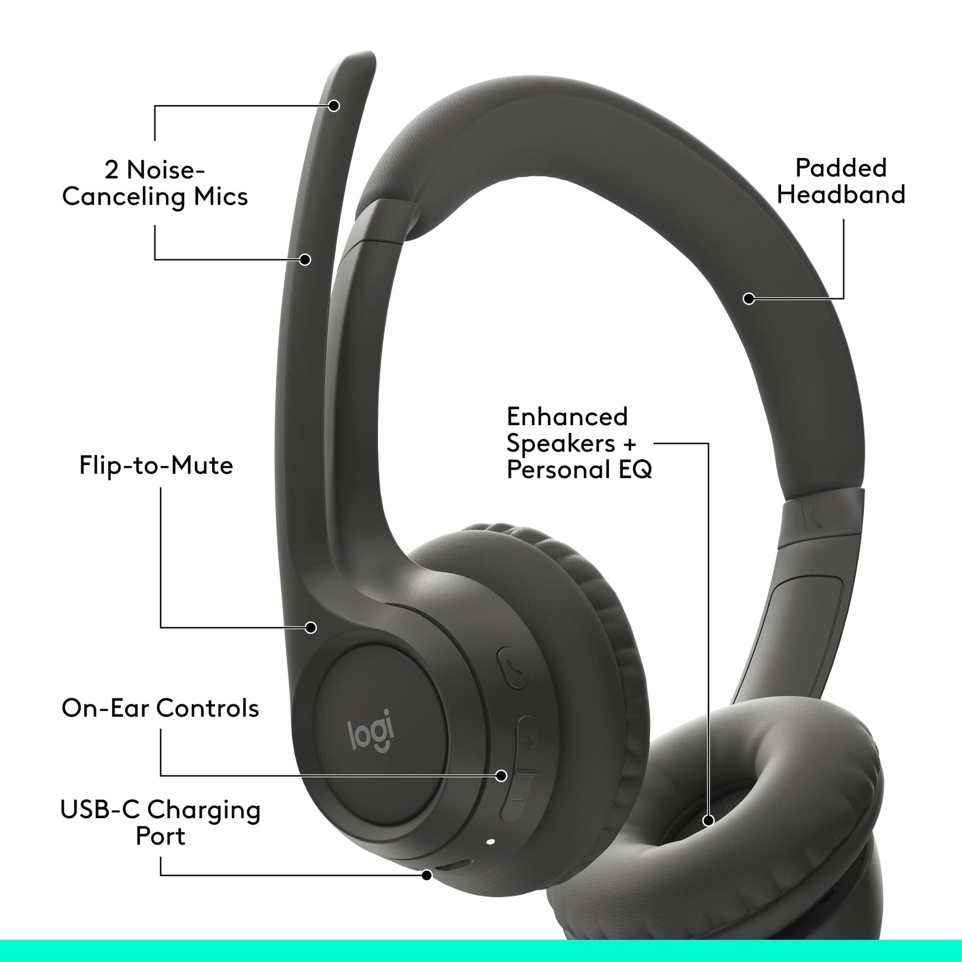 • Headset With Noise-Canceling Mic: Dual beamforming mics on the extended boom with noise-canceling algorithms suppress background noise in homes and shared workspaces for clear conversations