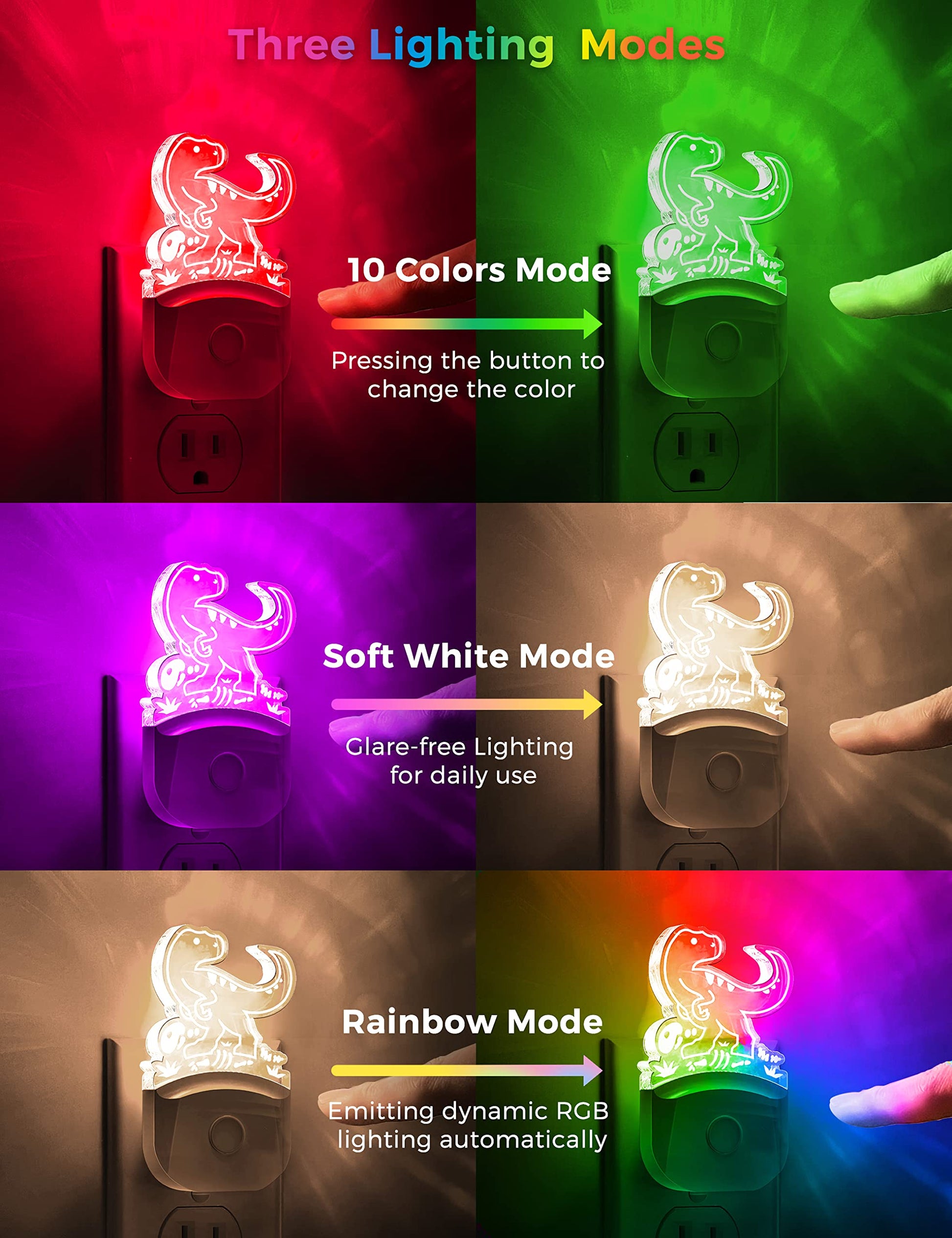 LOHAS Dinosaur Night Light for Boys, Kids Nightlight Plug in, Dusk-to-Dawn, Velociraptor LED Night Lights Plug into Wall, RGB+Soft White 3000K, 3 Lighting Modes, Ideal for Nursery Room, Bedroom Decor