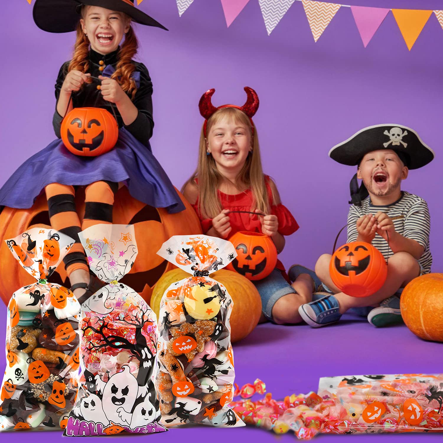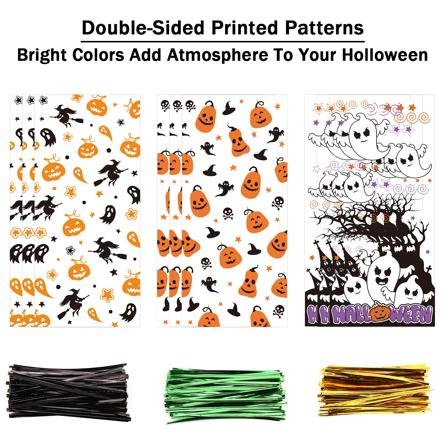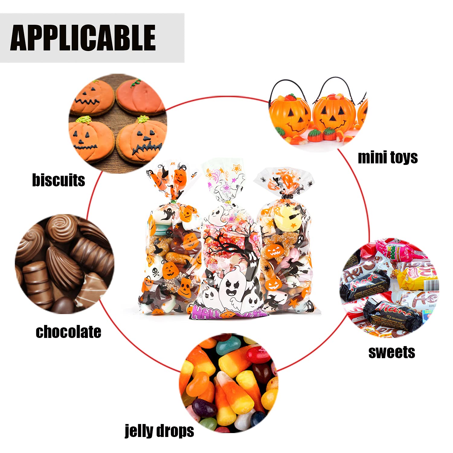 LOMIMOS 150PCS Halloween Cellophane Candy Bags, Clear Plastic Treat bags with 300PCS Twist Ties for Snacks cookies Gift Supplies