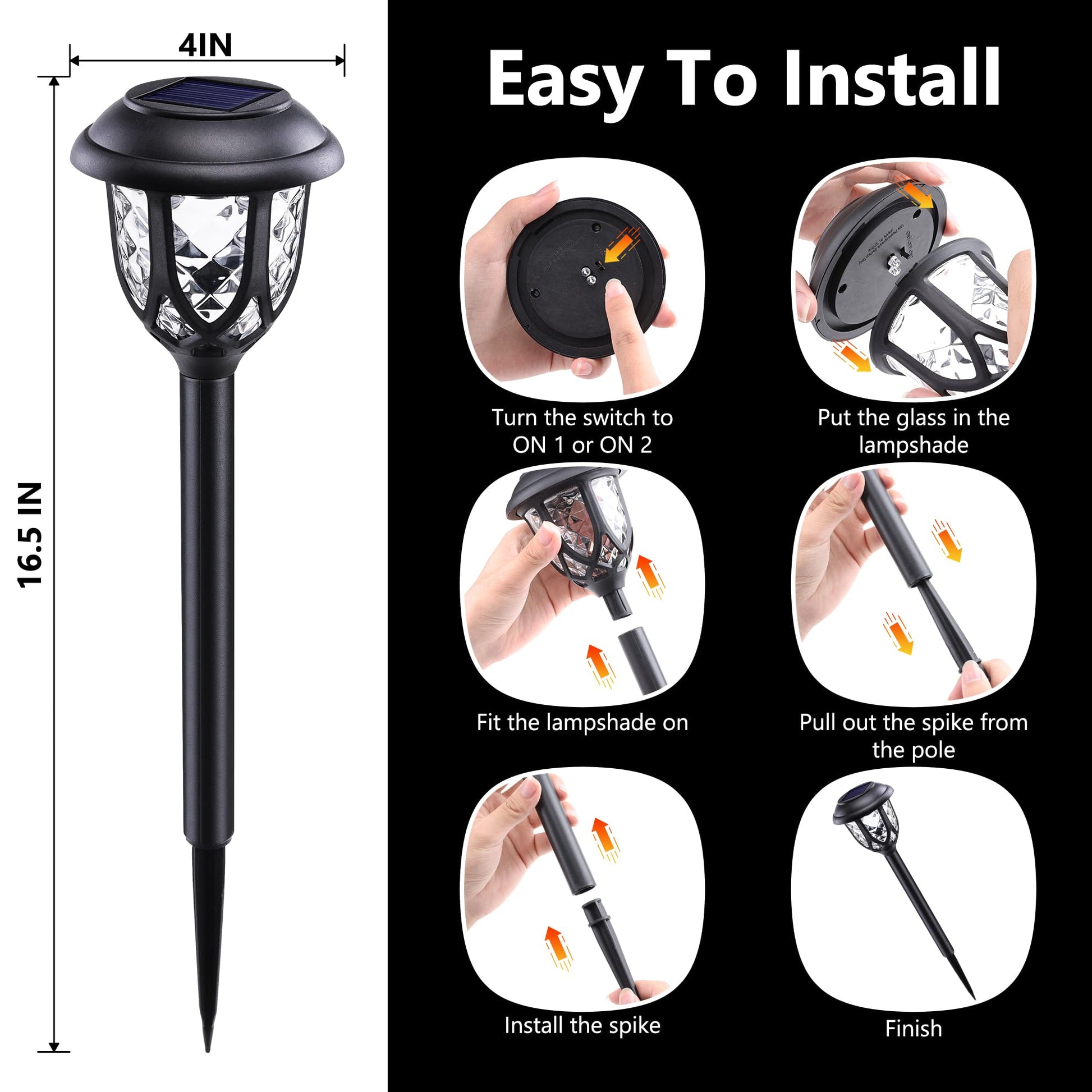 • Easy to Install: No wiring or additional tools are required to install these solar landscape lights. Simply combine the parts in the package and push these outdoor solar lights into the ground wherever you want to place them.