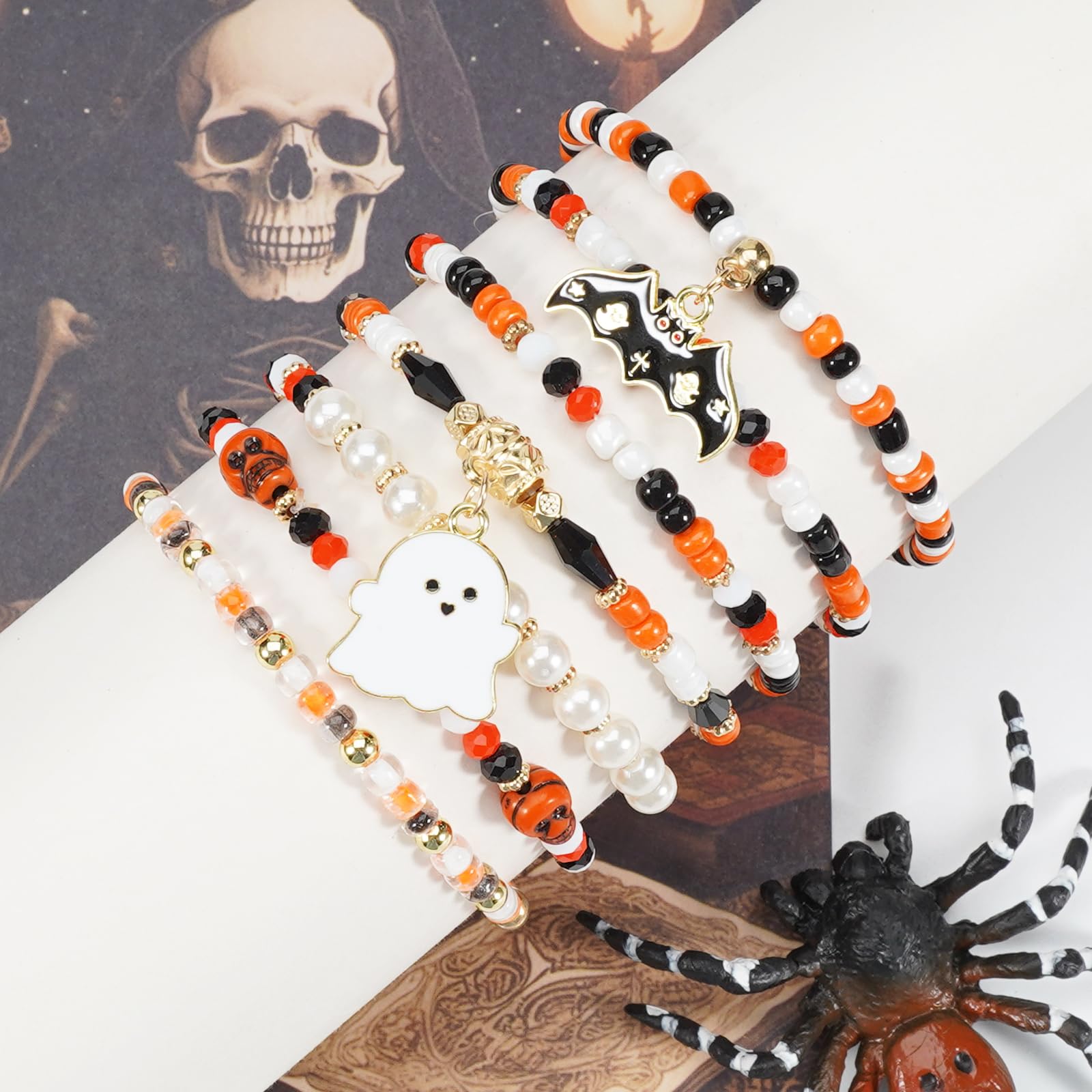 Lonext Halloween Bracelets Ghost Pumpkin Skull Skeleton Bat Spooky Bracelet for Women Boho Stretch Stack Bead Charm Heishi Bracelet