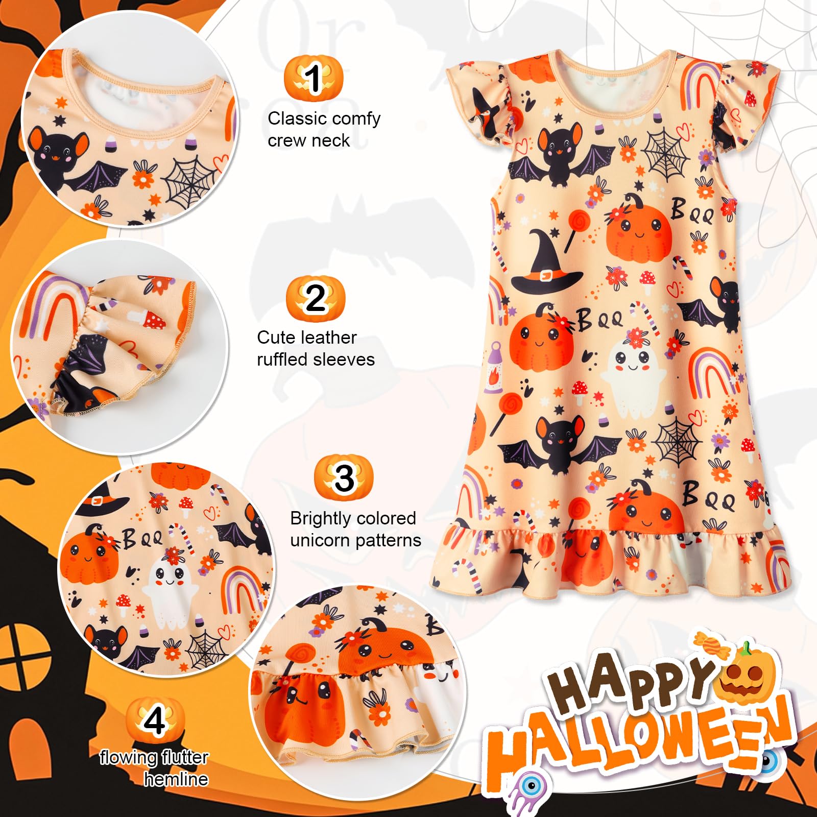 • Girls halloween nightgowns made of high quality milk silk and spandex, ultra soft material, more skin friendly and breathable, very comfortable for wearing, Protect your child's sleep quality.