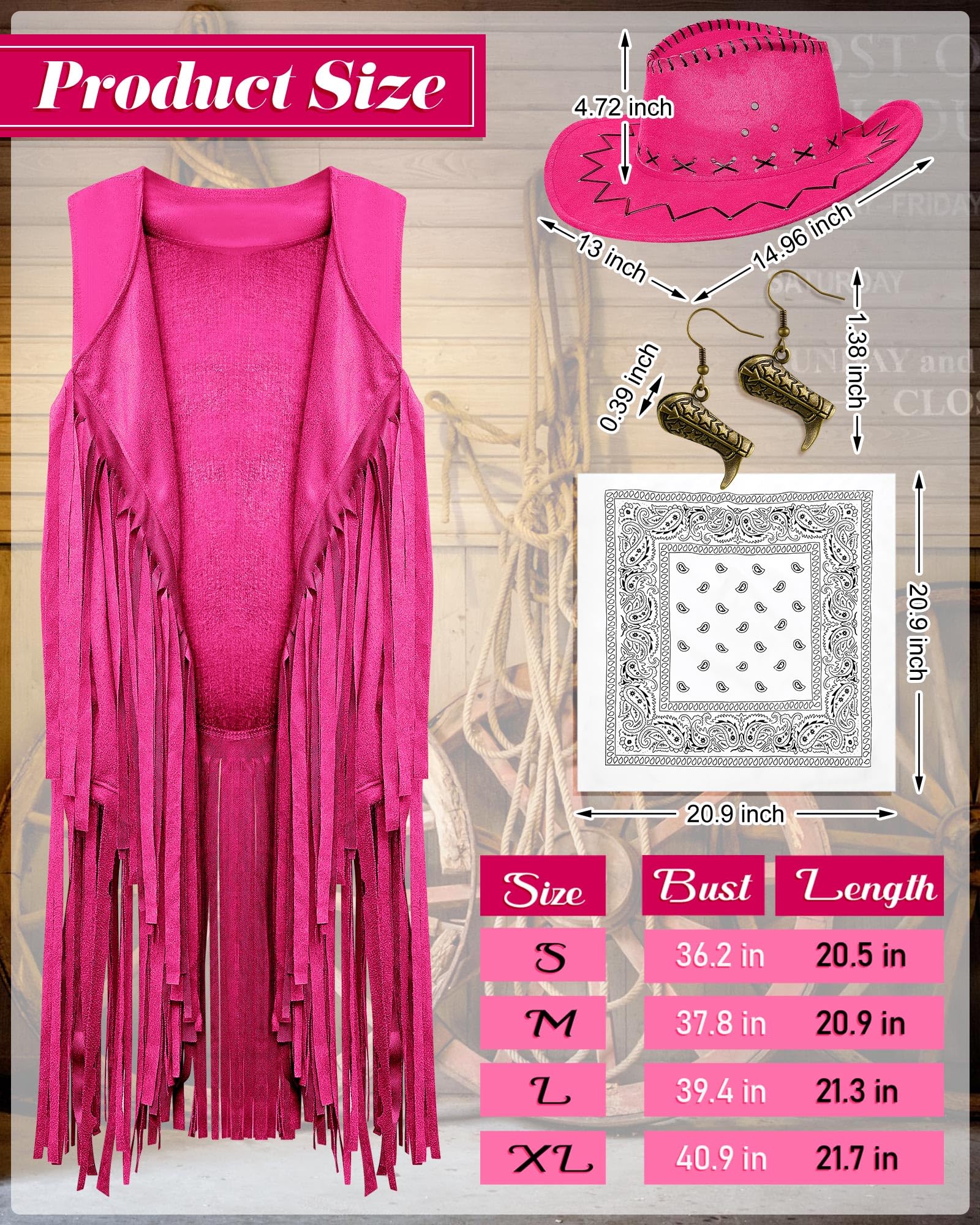 Proper Size Fits Most: the fringe vest is available in different sizes; The hat is about 14.96 x 13.39 inch, and the bandana is about 20.86 x 20.86 inch, suitable for most adults; Please confirm the size before you buy them