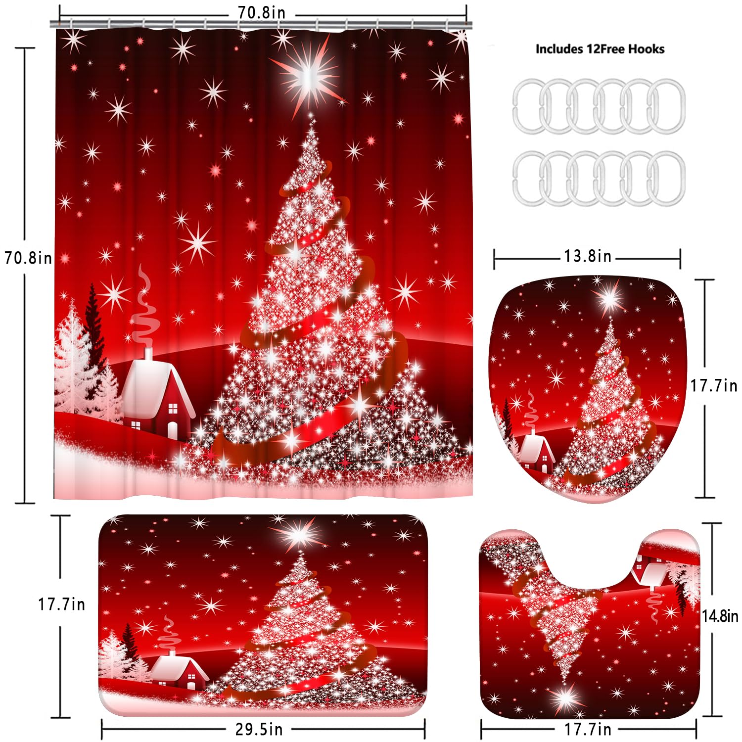 Yddsky 4PCS Red Christmas Tree Shower Curtain Sets, Christmas Village Printed Shower Curtain Sets with Rugs, Toilet Lid Cover and Bath Mat for Bathroom Set Decor Christmas Bathroom Decor Theme