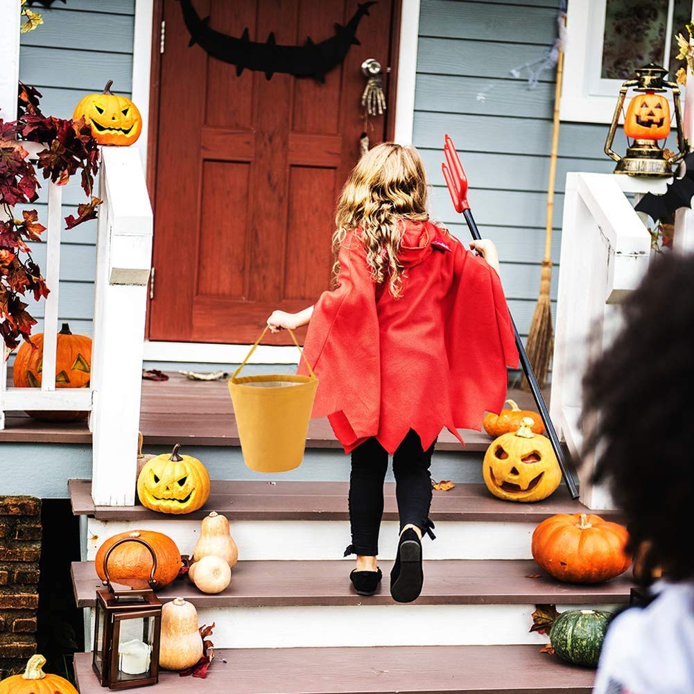 The Halloween candy bucket features large size to accommodate as many as candies on Halloween and they can carry this bag to knock the door of neighbors and relatives to ask for candies, no worries about having no space for holding the candies.